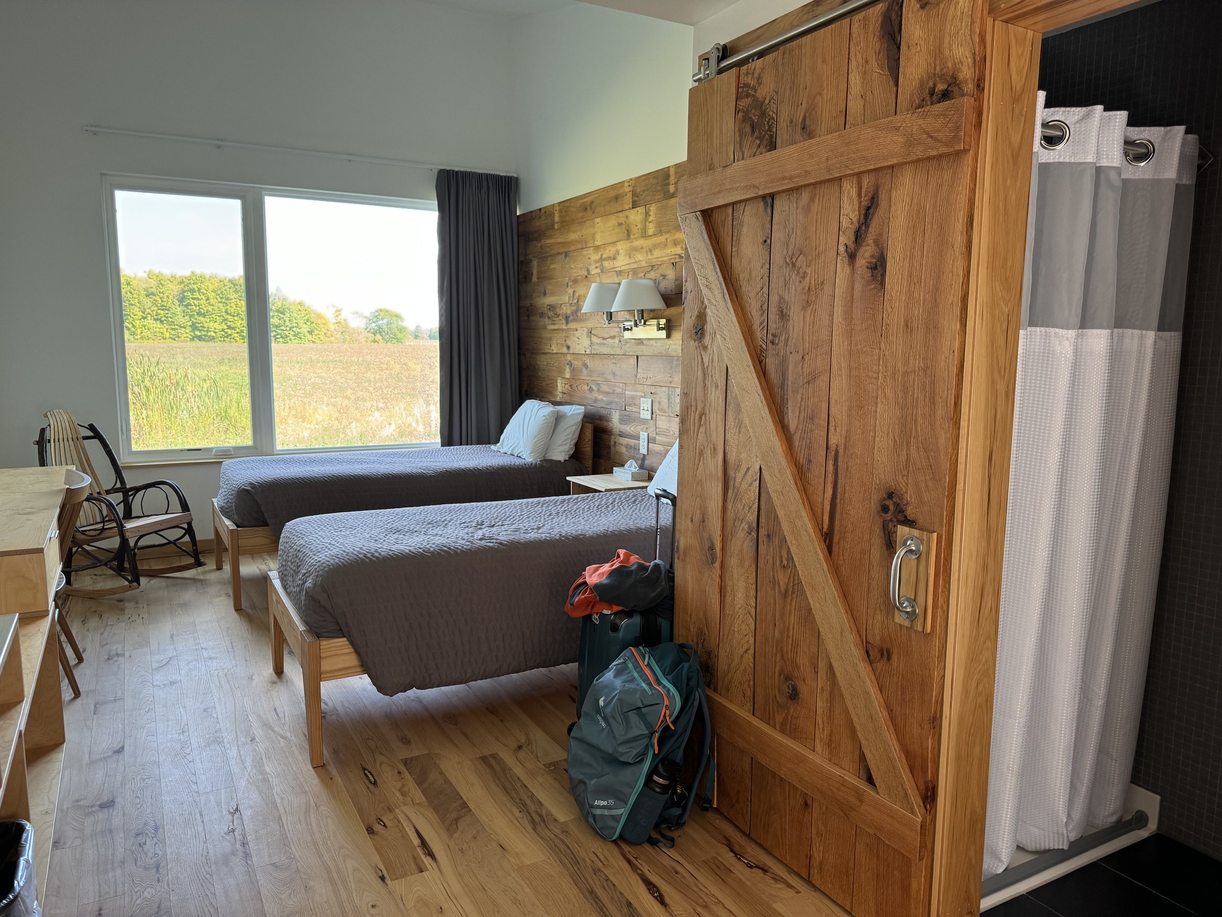 The 40 overnight rooms are single or double occupancy with a private bath. Most rooms have two extra-long twin beds, although several have queen beds. There are five buildings of five rooms each that overlook the bluff down to the recreational area. Each of those five buildings includes a lounge and kitchenette for small group gatherings. Each retreat room is climate controlled and linens and towels are provided. Although all buildings and rooms meet ADA standards, the 10 rooms in the first two buildings have rooms that are specifically wheel-chair accessible. A covered walkway connects these two buildings to the Grange. Price includes room, meals, and program fee.